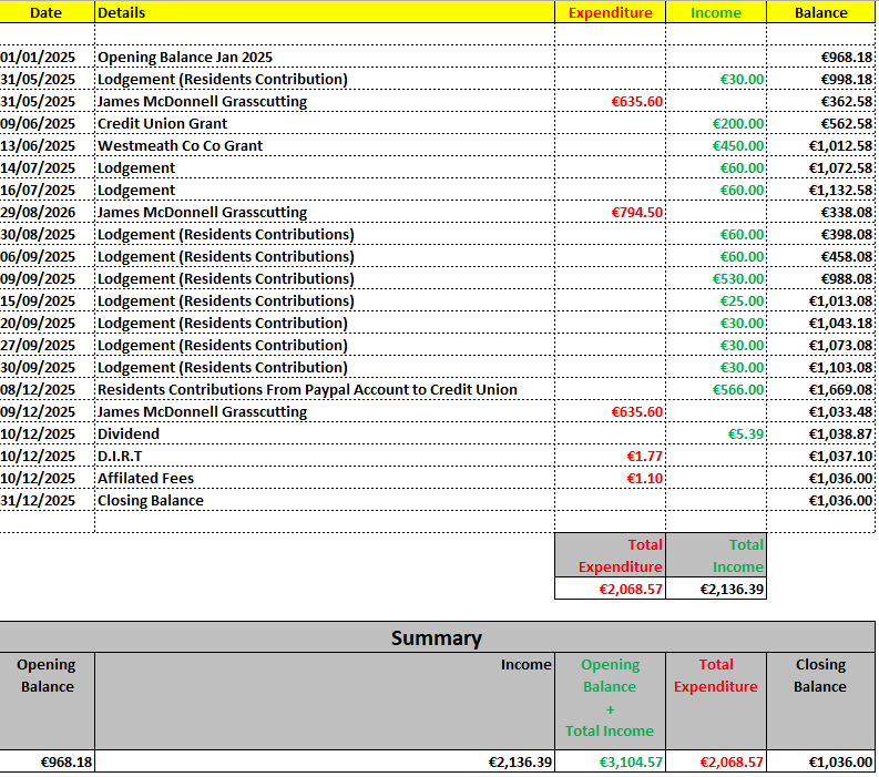 If you contributed, sincere thanks to you. We also wish to thank Mullingar Credit Union and Westmeath Co. Co. for their grant awards. As you can see from the accounts, it is not possible to cover the essential common area grass cutting costs without their and your generous help. If you wish to help with the costs for 2026, please consider donating securing via our Paypal link on this website or via a bank transfer.
